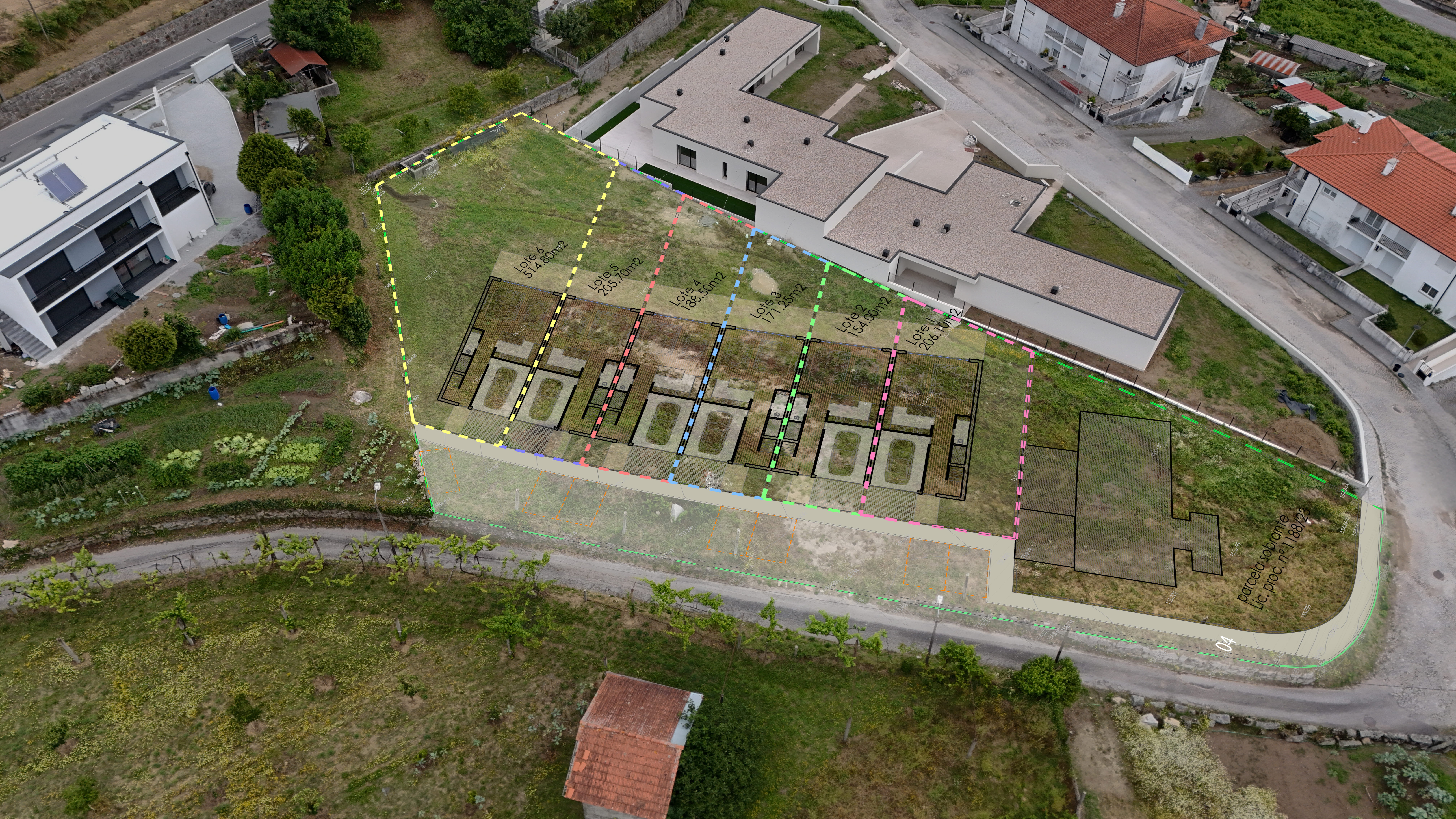 estes 6 lotes de terreno contemplam projeto aprovado para a construção de moradias individuais com área de construção de aproximadamente 300 m2, com 3 suítes, escritório, cozinha e sala open space e garagem.